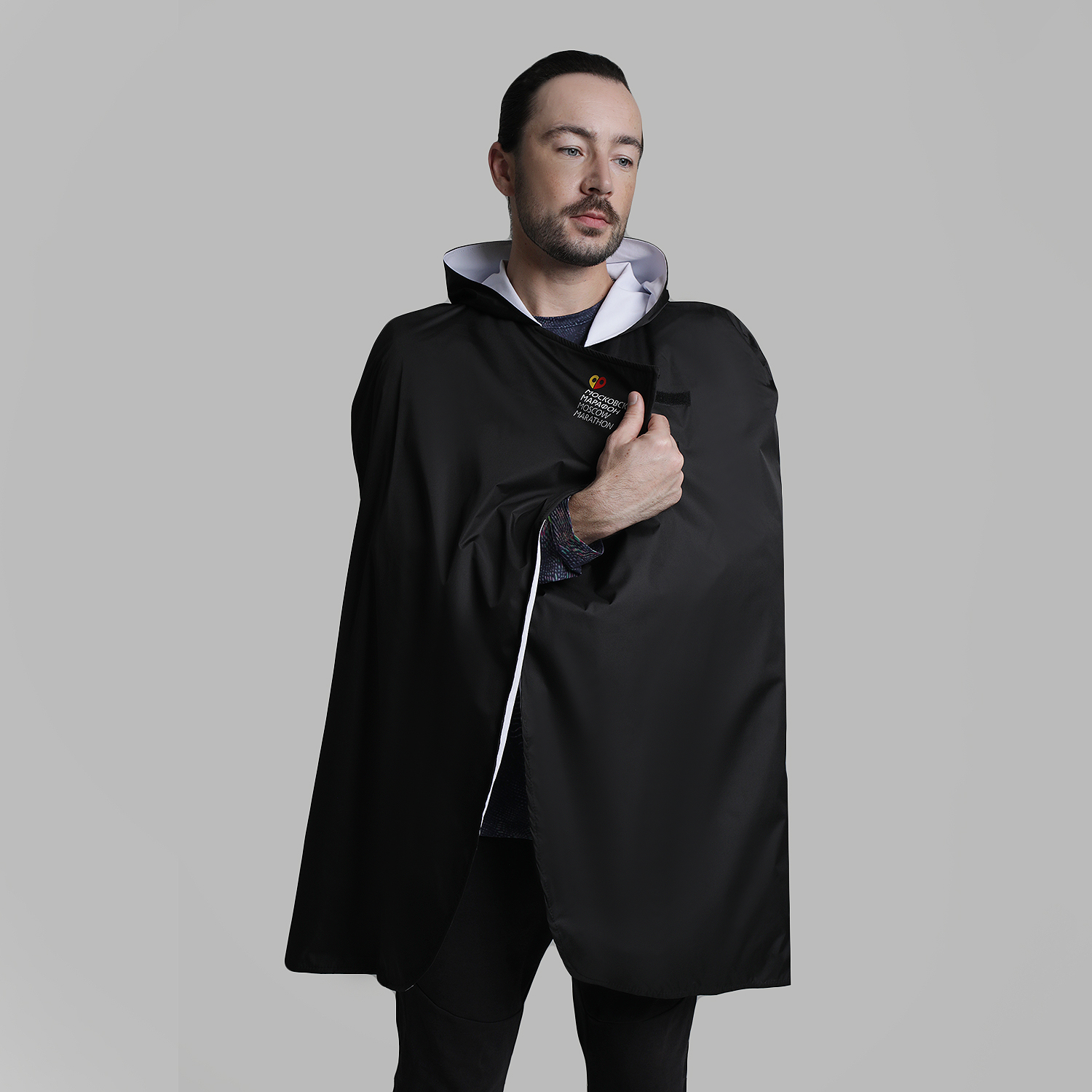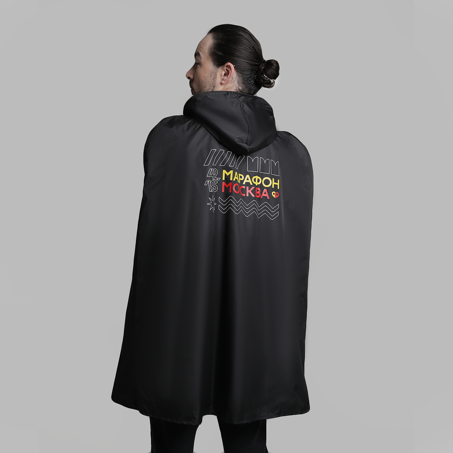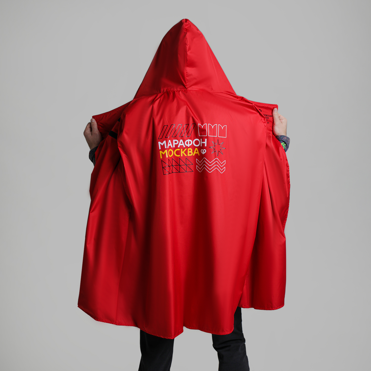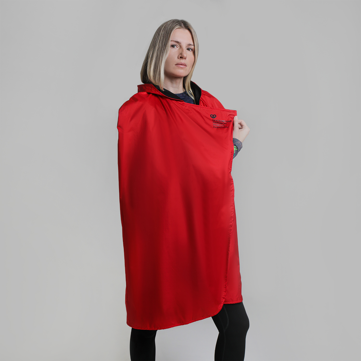 Накидка выполнена в стиле марафона и доступны в двух цветах — чёрном и красном. Они не промокнут и сохранят тепло на финише не только Московского Марафона, но и любого вашего забега или длительной тренировки.