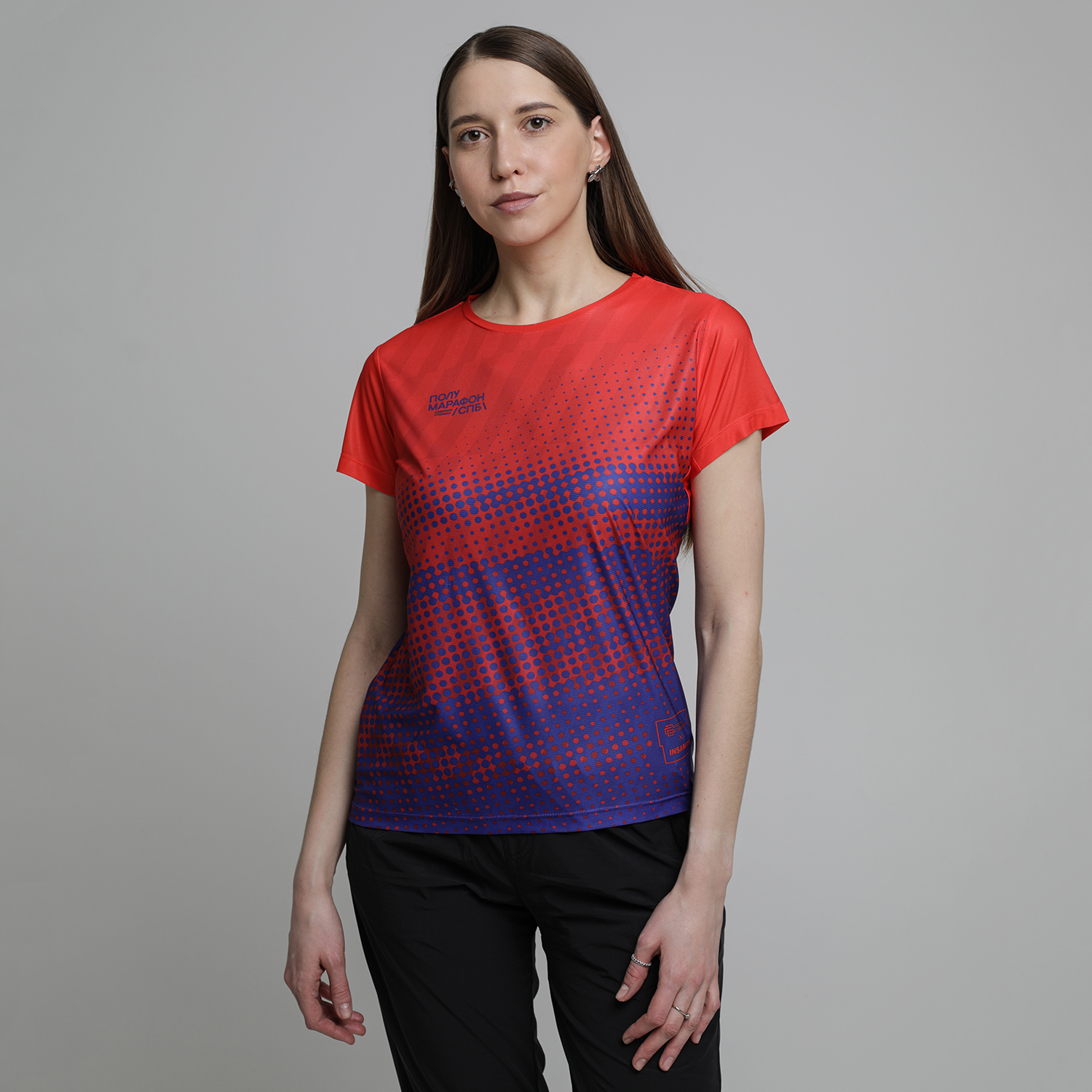 Футболка имеет спортивный крой и выполнена в уникальном дизайне от Бегового сообщества. Для пошива использован ультралёгкий материал, поэтому вес изделия в зависимости от размера варьируется от 60 до 75 граммов. Ткань имеет антистатическое покрытие, а ещё она быстро впитывает влагу с поверхности тела и выводит её наружу благодаря уникальной структуре волокон DRY TOUCH.