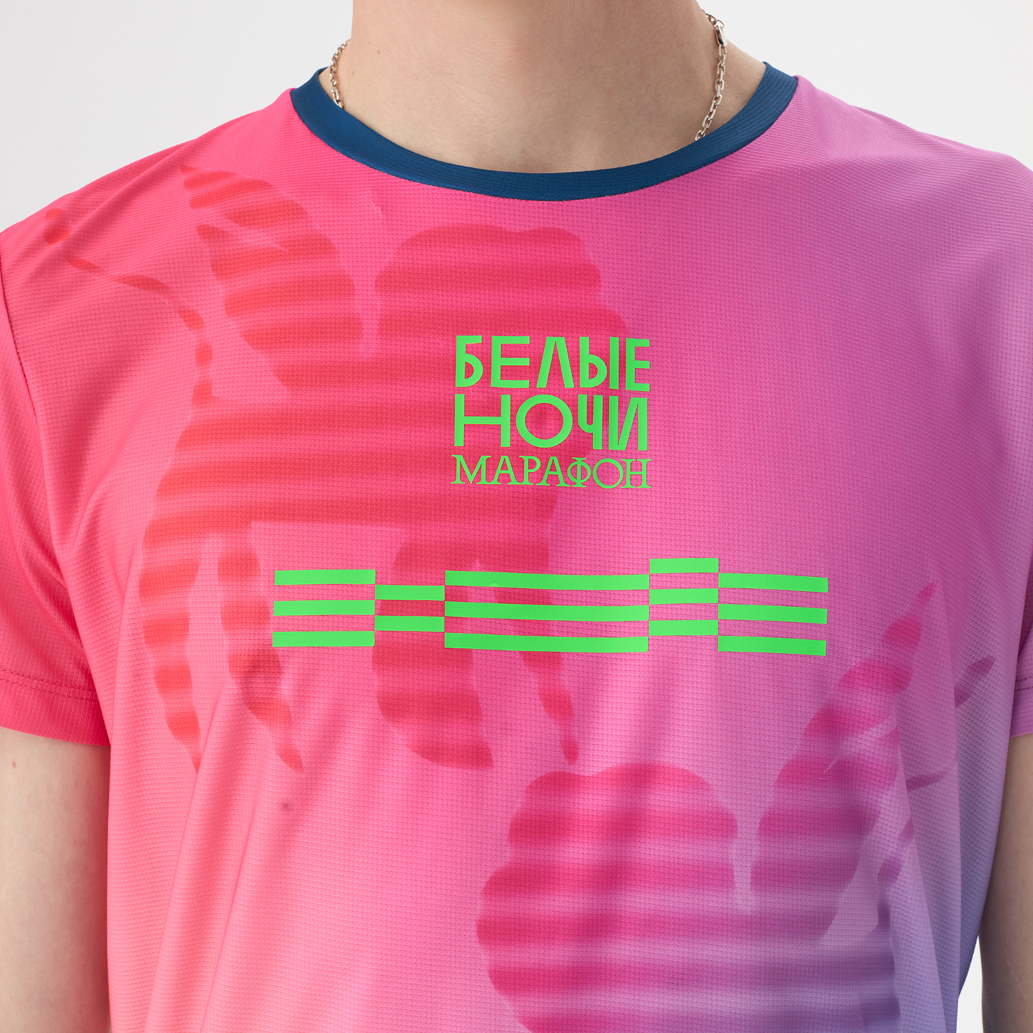 Футболка участника марафона «Белые ночи» в фирменном стиле и цветах забега. Модель свободного кроя со светоотражающими элементами и тонкими плоскими швами. Подойдёт для тренировок в тёплую погоду.