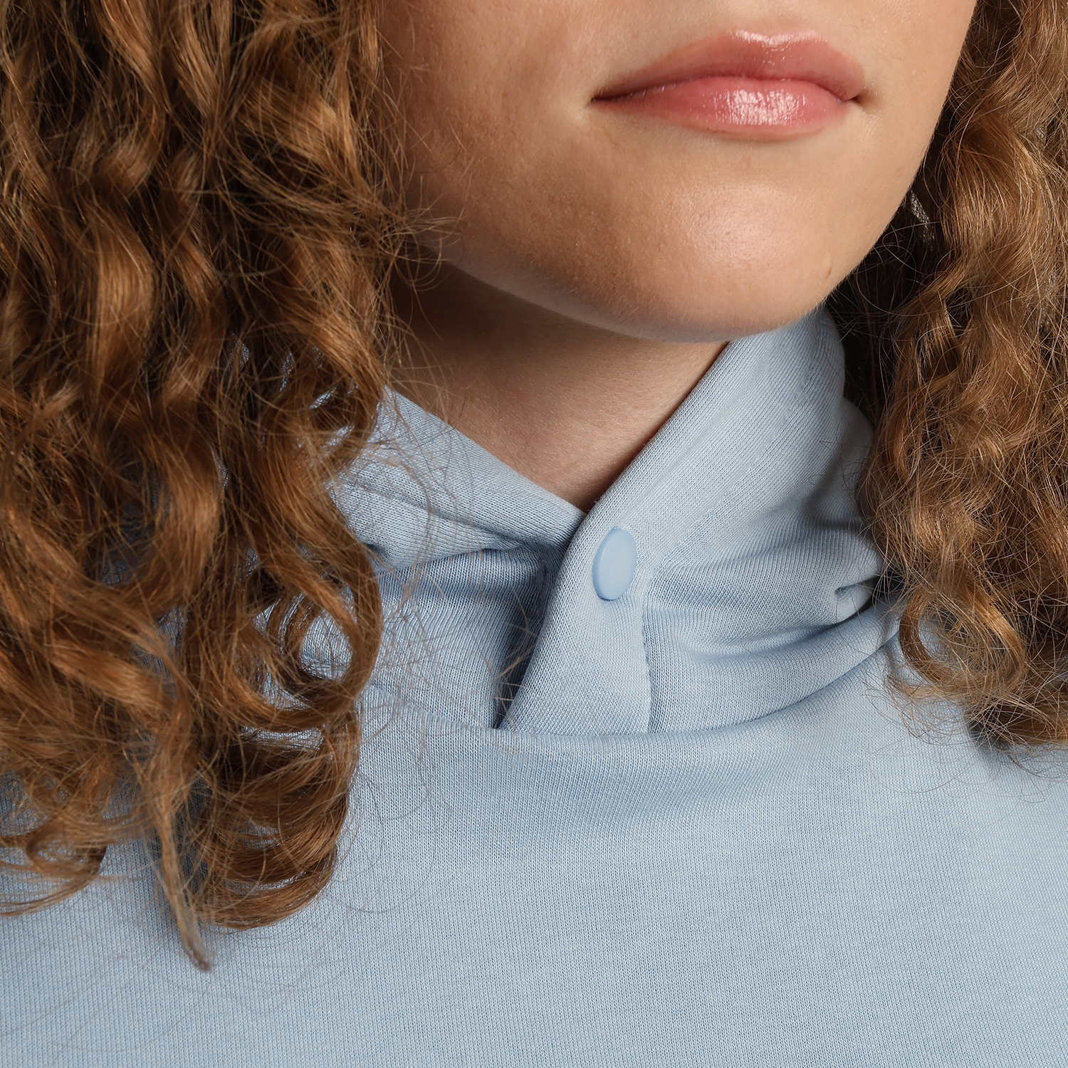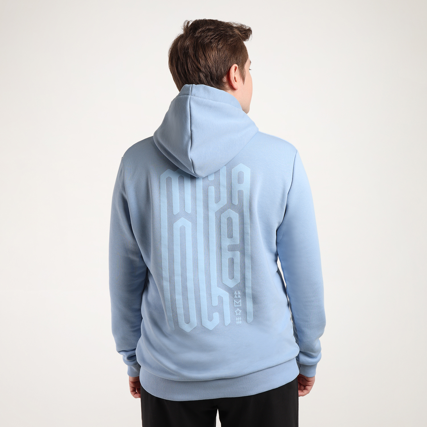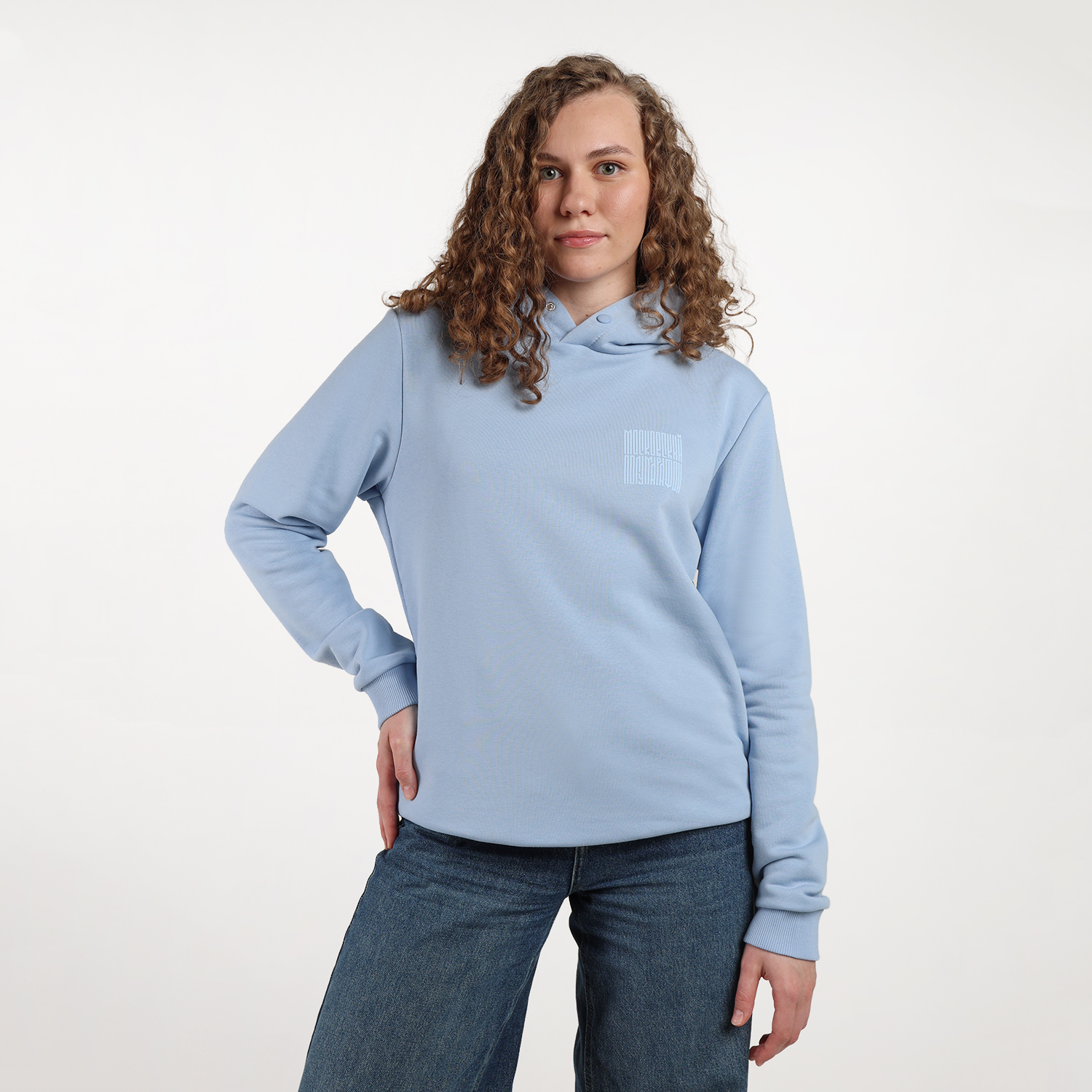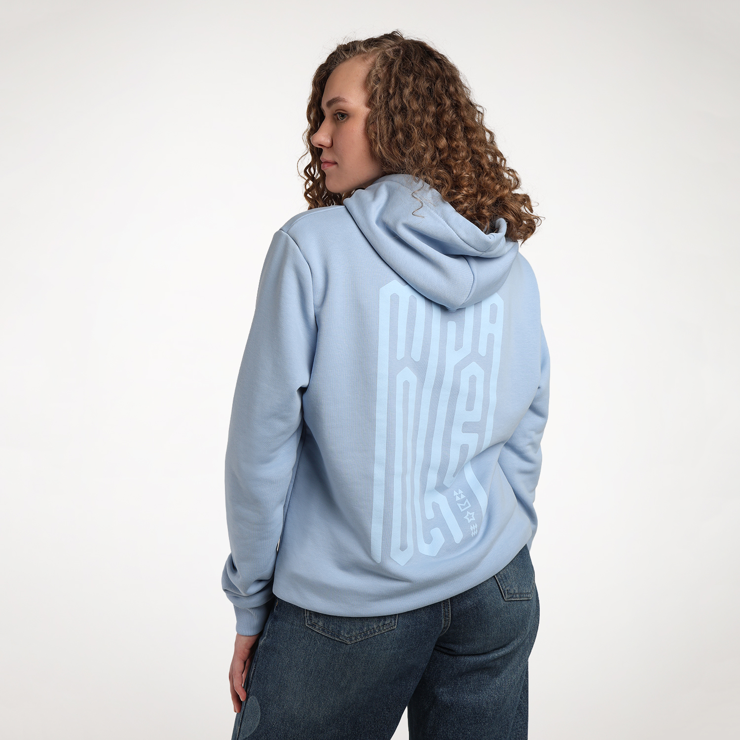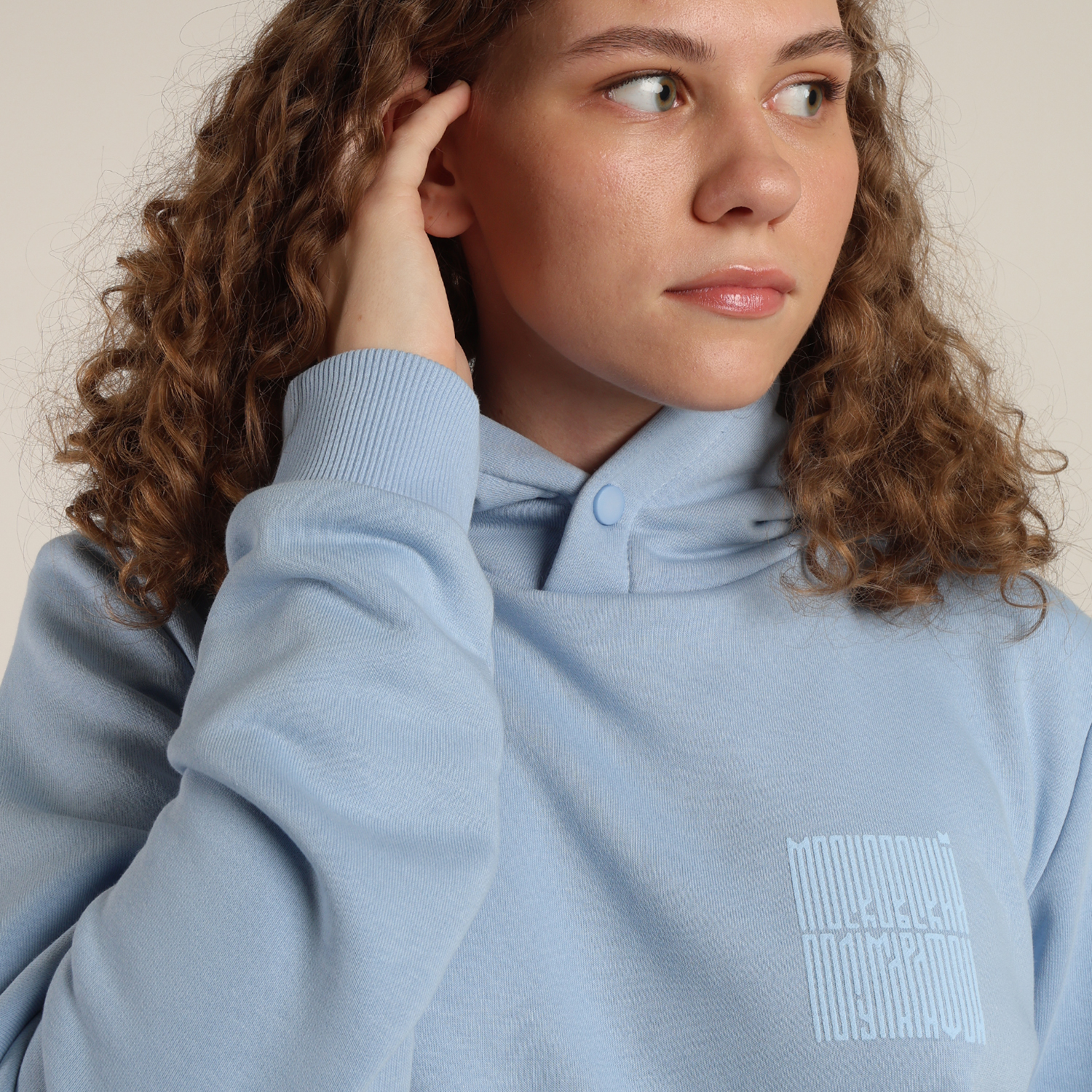 Толстовка с капюшоном из футера голубого цвета. Модель унисекс – единая размерная сетка для мужчин и женщин.